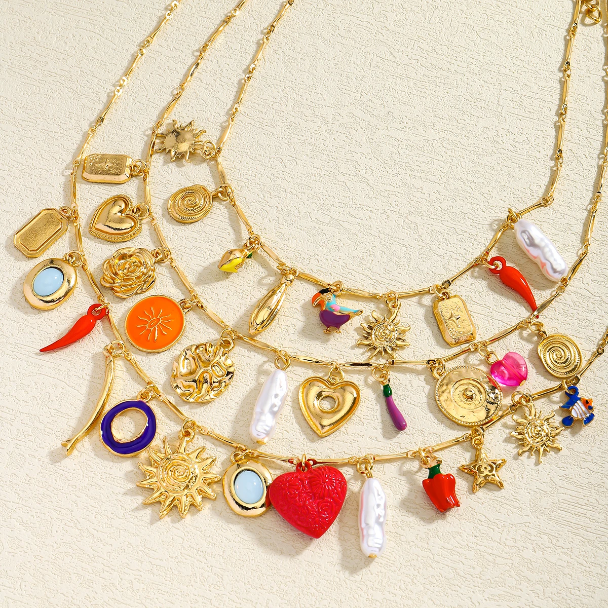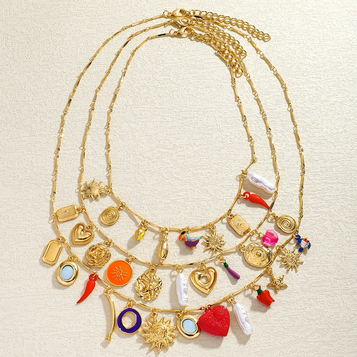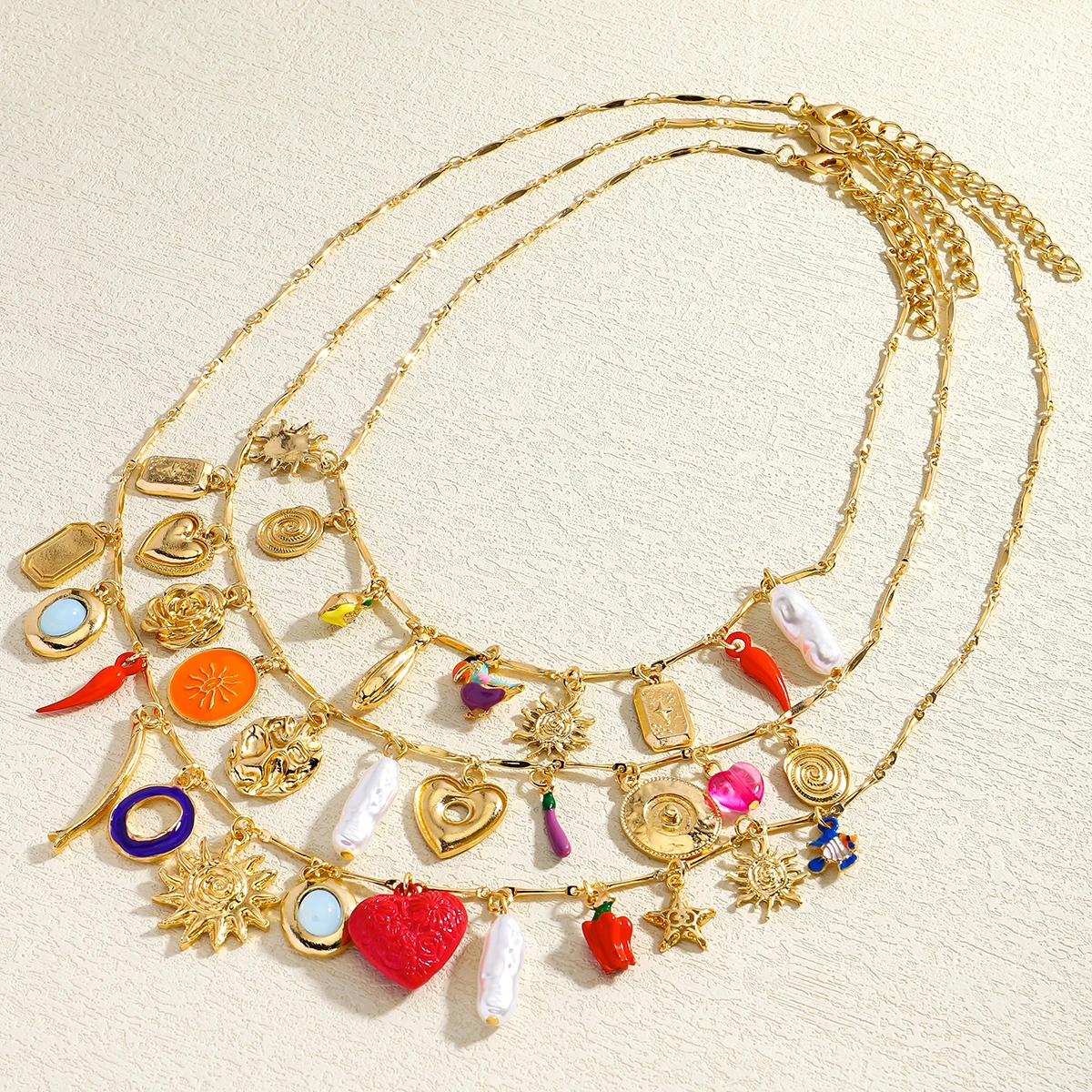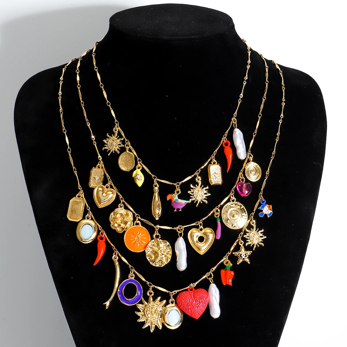 Luxurious Three-Layer Gemstone Necklace Bohemian Heart Baroque Pearl Sun Elegant Multi-Layer Jewelry for Party And Banquet Wear